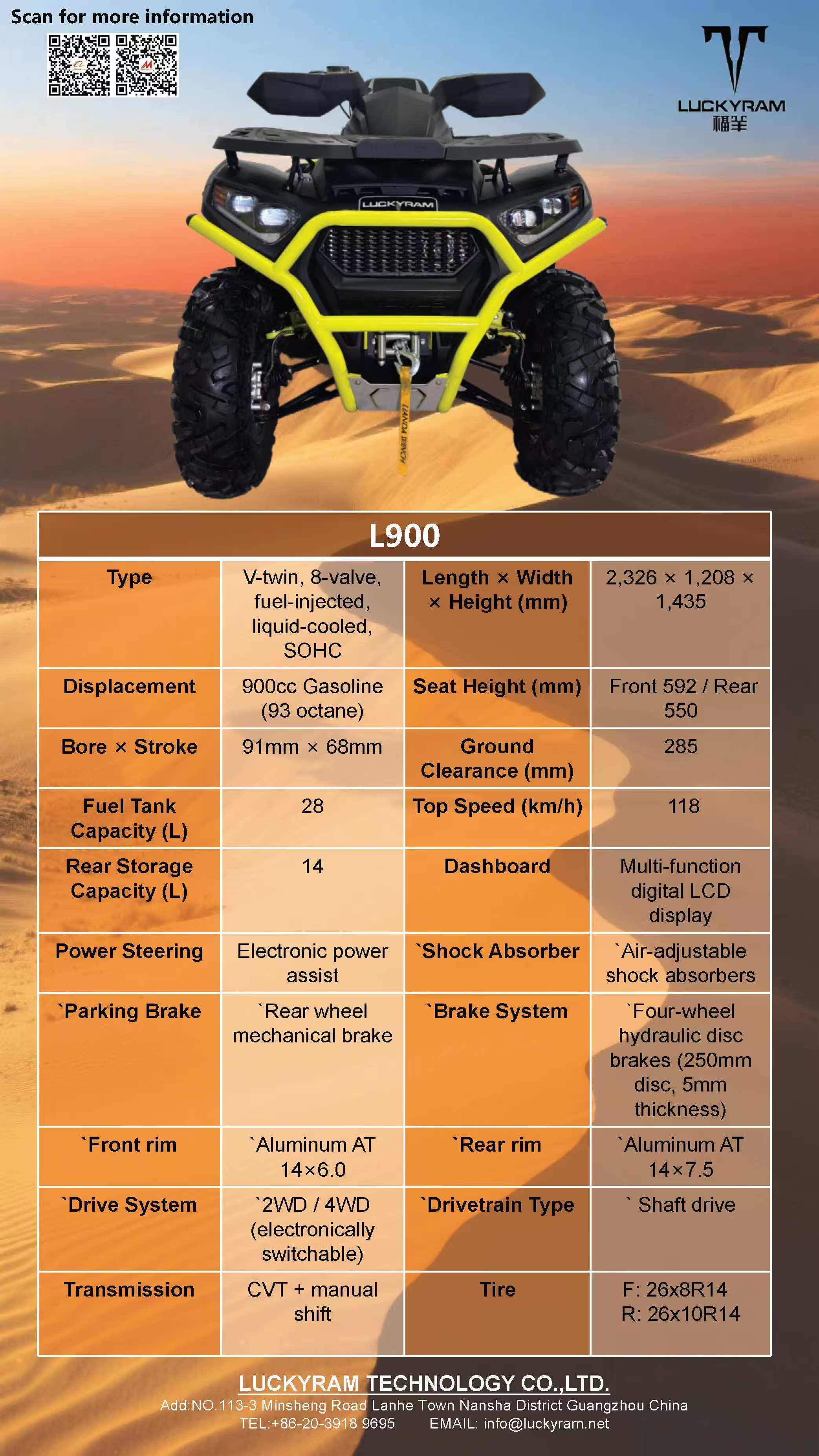 Потужний двигун-оснащений високоефективним 4-х тактним двигуном 900 куб. Грязь, пісок та скелясті стежки. Навантаження та буксирування з високою потужністю-розроблені з сильними стелажами та буксируванням, здатним витягувати важкі навантаження на роботу або рекреаційну конструкцію-ергономічні сидіння, чуйні ручки та інтуїтивно зрозумілі контролі, що підсилюють комфорт Rider під час тривалої їзди. Дискові гальма (спереду та ззаду) Забезпечуйте швидкі, безпечні зупинки навіть на великих швидкостях. Аплікації ATV 900CC: Позашляховий відпочинок-ідеально підходить для їзди на стежках, дюн-башингу та вивчення міцних пейзажів. Продуктивність у віддаленій або складній місцевості для надзвичайних місій. Довість та грязьова місцевість - 4WD -здатність та глибокі шини протектора, що знають у слизьких або пухких умовах ґрунту.